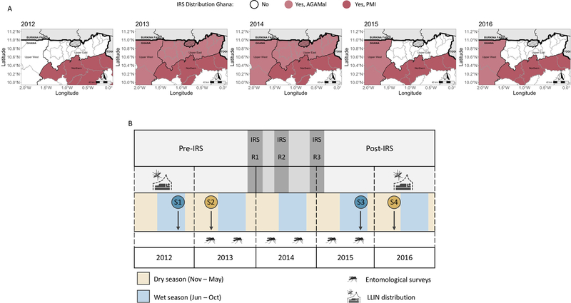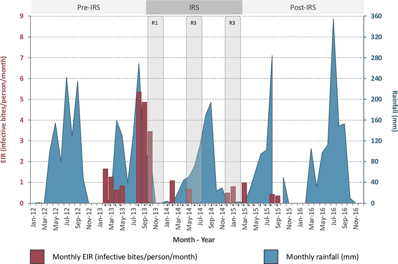 High-malaria burden countries in sub-Saharan Africa are shifting from malaria control towards elimination. Hence, there is need to gain a contemporary understanding of how indoor residual spraying (IRS) with non-pyrethroid insecticides when combined with long-lasting insecticidal nets (LLINs) impregnated with pyrethroid insecticides, contribute to the efforts of National Malaria Control Programmes to interrupt transmission and reduce the reservoir of Plasmodium falciparum infections across all ages. Using an interrupted time-series study design, four age-stratified malariometric surveys, each of ~2,000 participants, were undertaken pre- and post-IRS in Bongo District, Ghana. Following the application of three-rounds of IRS, P. falciparum transmission intensity declined, as measured by a >90% reduction in the monthly entomological inoculation rate.