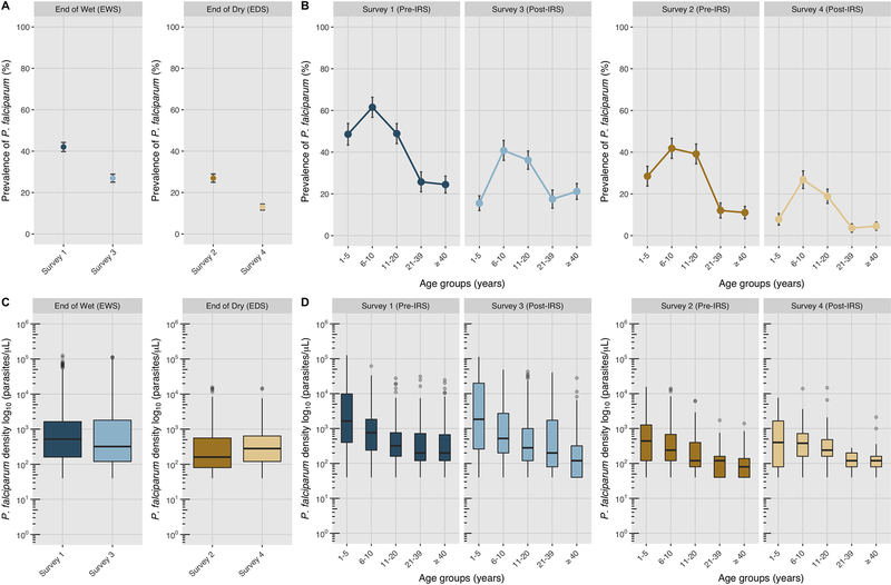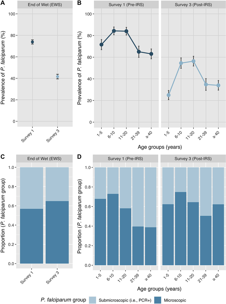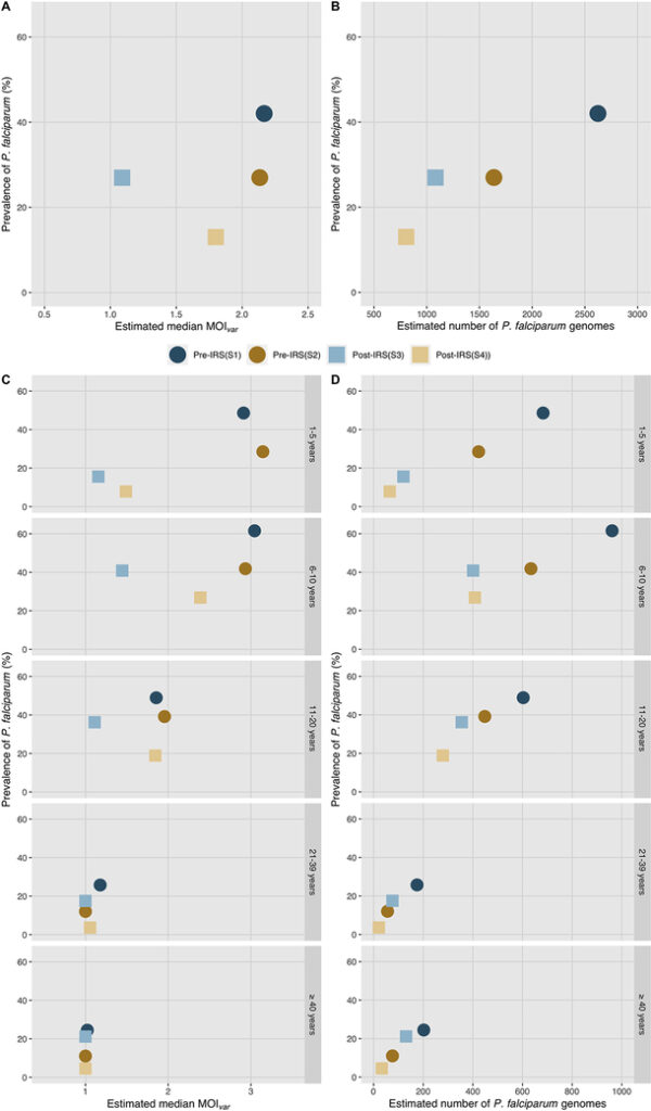 This decline was accompanied by reductions in parasitological parameters, with participants of all ages being significantly less likely to harbor P. falciparum infections at the end of the wet season post-IRS (aOR = 0.22 [95% CI: 0.19-0.26], p-value < 0.001). In addition, multiplicity of infection (MOI var ) was measured using a parasite fingerprinting tool, designed to capture within-host genome diversity. At the end of the wet season post-IRS, the prevalence of multi-genome infections declined from 75.6% to 54.1%.